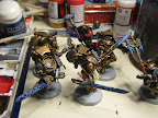 The blades were based with the Necron Abyss and then I painted a lightning like pattern with lighter and lighter blue and finished it with a thin white line. To finish them I need to do some highlighting on the edges and the white haze effect mentioned in the tutorial.